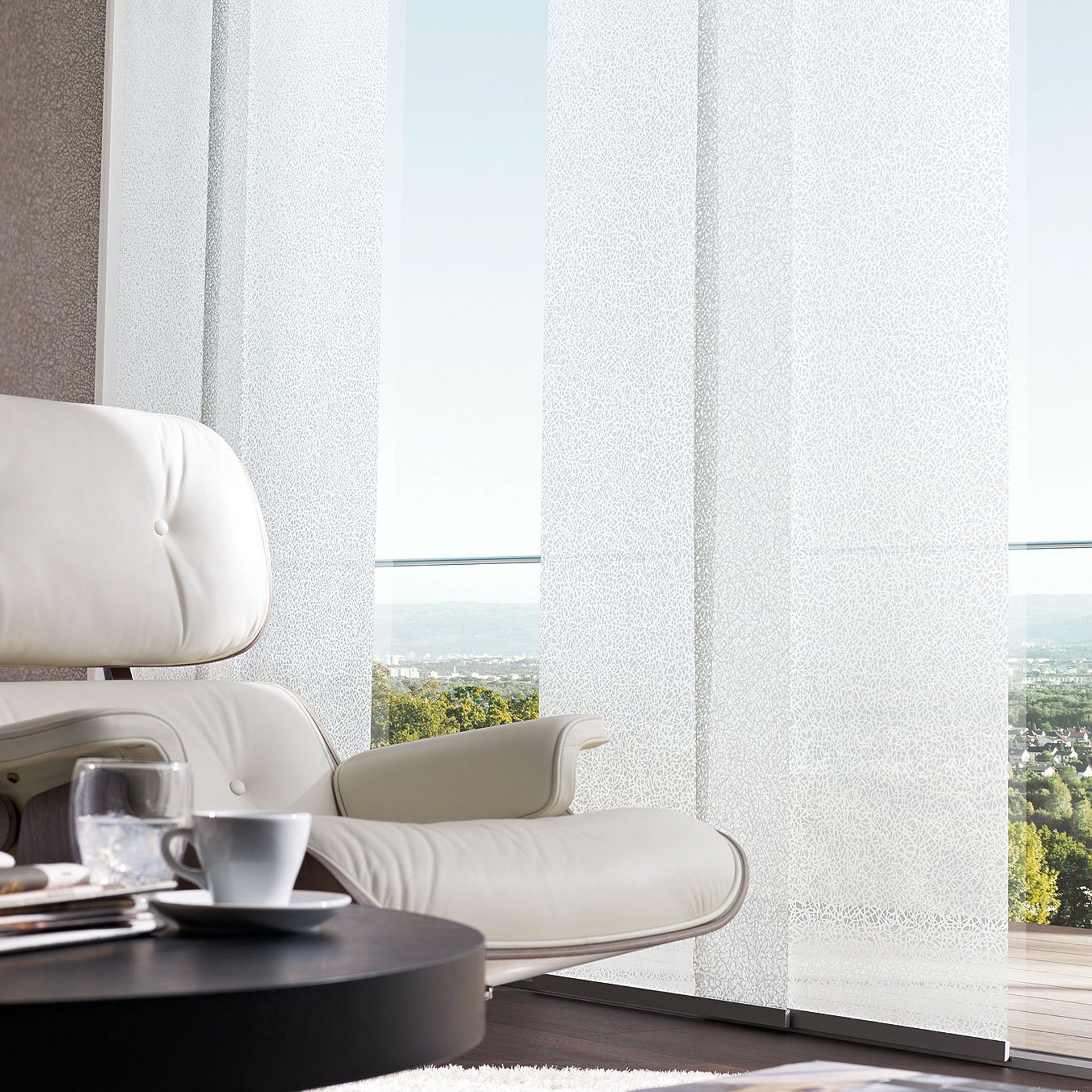 Die Paneele sind in individuellen Größen und praktisch unendlich vielen verschiedenen Stoffdesigns erhältlich. Die Paneele lassen sich einfach abnehmen und austauschen (Befestigung mittels Klettband). Die Montage der Schiebevorhänge erfolgt wahlweise an Wand oder Decke. Besonders für große Fenster, Glasfronten oder als Raumteiler bestechen Flächenvorhänge mit ihrer modernen, reduzierten Formensprache.